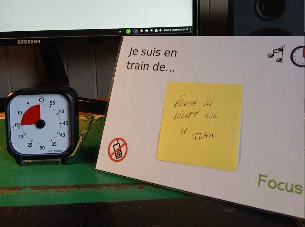 Le panneau me rappelle également de mettre le Time Timer (pomodoro) en route et éventuellement pour moi une musique douce non-mélodique ou un bruit blanc (rivière, feu qui crépite, pluie…).