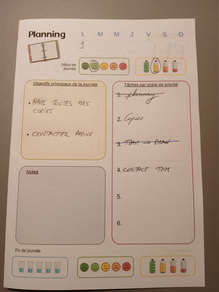 J’utilise TickTick au quotidien. Il est plus aisé de réactualiser son emploi du temps. Toutefois, en début de journée, je planifie mes tâches à venir par écrit et essaie de m’y tenir. J’ai créé/adapté un document le plus clair et épuré possible.